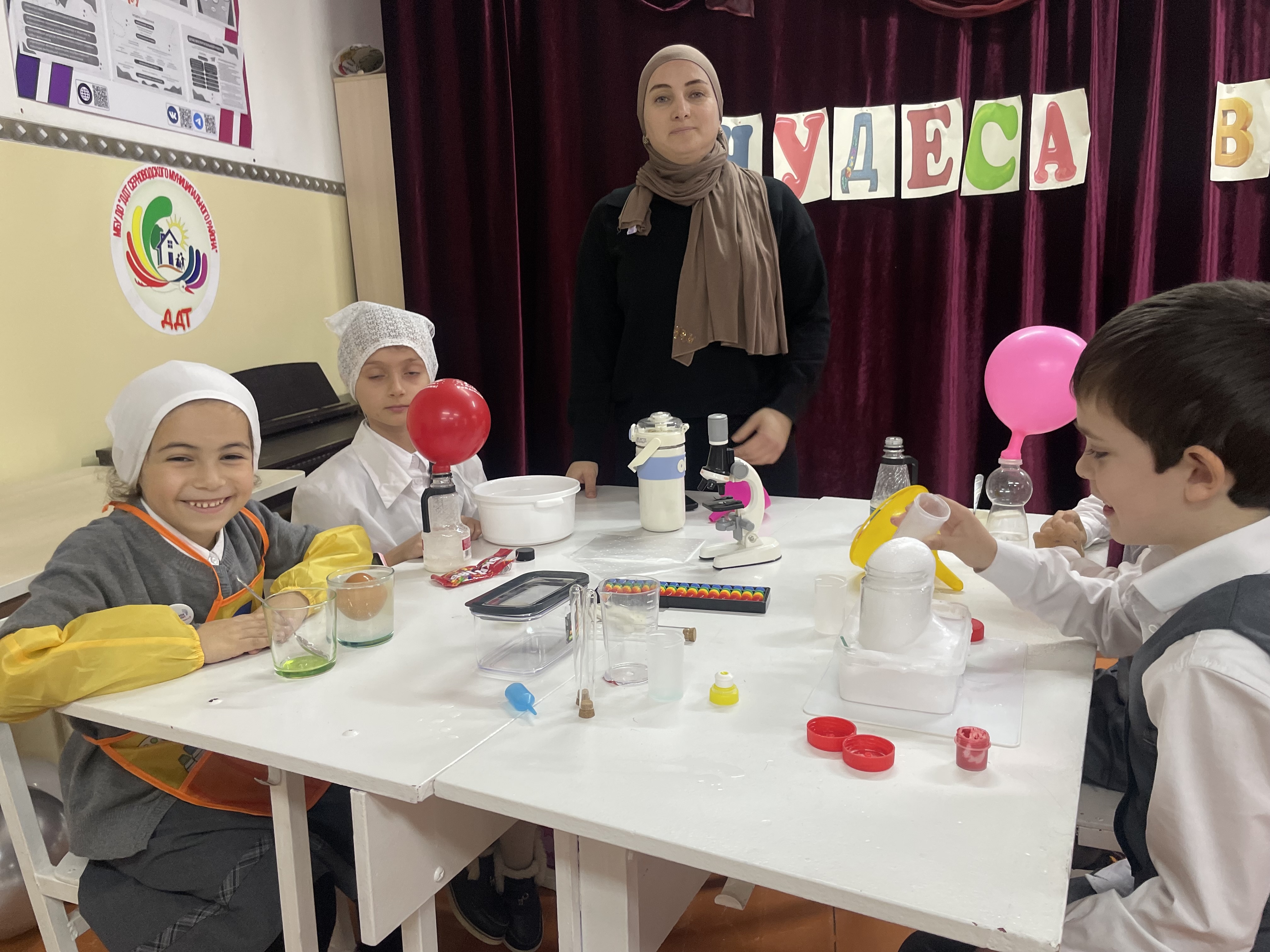 -Опыт «Волшебный шарик» (воздействие тепла на газы). Дети надули воздушный шарик и поместили его рядом с источником тепла — шарик увеличился в объёме, что продемонстрировало расширение газа при нагревании.