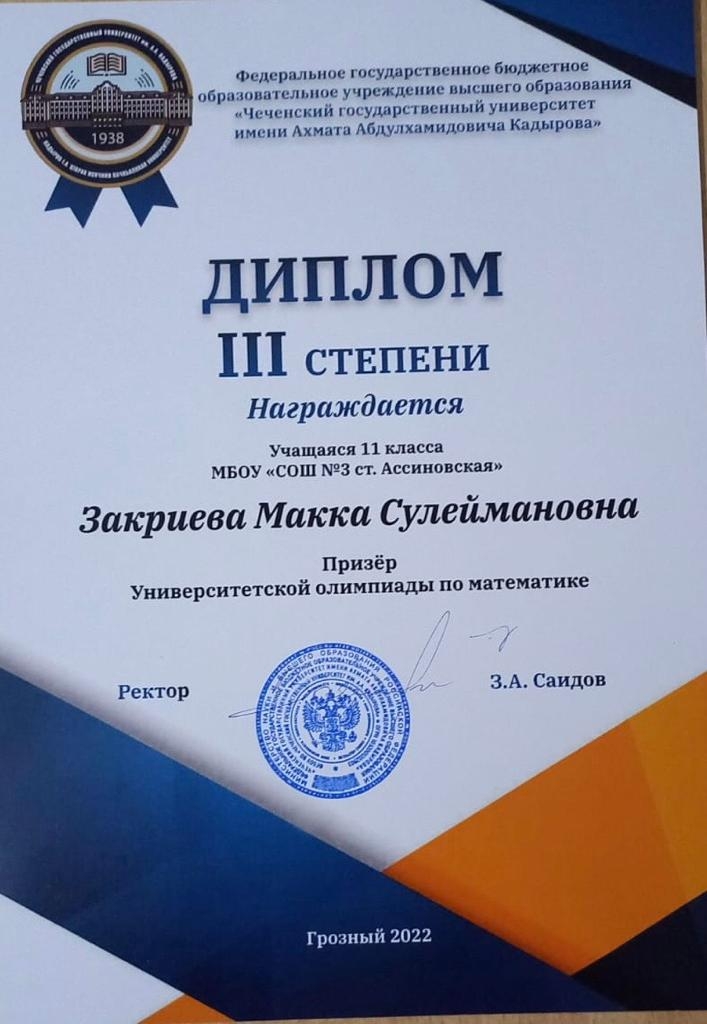 А. за подготовку к Университетской олимпиаде по математике и информатике ученицы нашей школы Закриеву М.