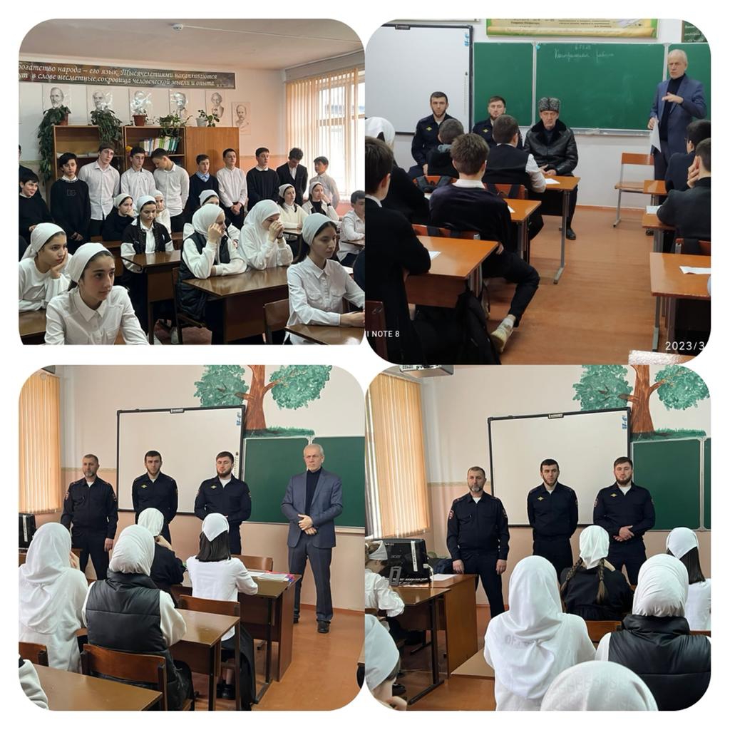 С целью профилактики преступности в молодежной среде, а также других правонарушений и преступлений, совершаемых несовершеннолетними, 24.02.2023 г в школе была проведена профилактическая беседа на тему: «Наркомания и токсикомания». Беседу проводили: начальник УУП и ПДН ОМВД России по Серноводскому району ЧР майор полиции Хачубаров Алхазур Усамович , старший инспектор ПДН, лейтенант полиции Хозаев Джовхар Адамович и лейтенант полиции Эскиев Ахмед Вахаевич .