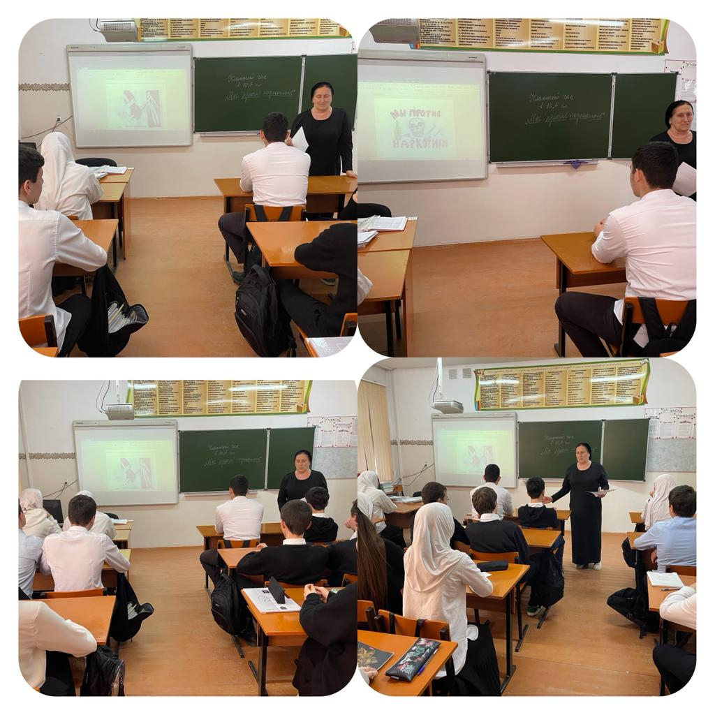 Классный руководитель 10 а класса Аминат Шамиловна рассказала ребятам о юридической и личной ответственности несовершеннолетних за употребление и распространение наркотических средств. Так же рассказала учащимся об отношении молодого поколения к своему здоровью. Как употребление наркотиков убивает молодёжь, о том, насколько сокращается жизнь человека, решившего поменять здоровый образ жизни на вредные привычки, напомнила подростком о соблюдении «Детского закона».
