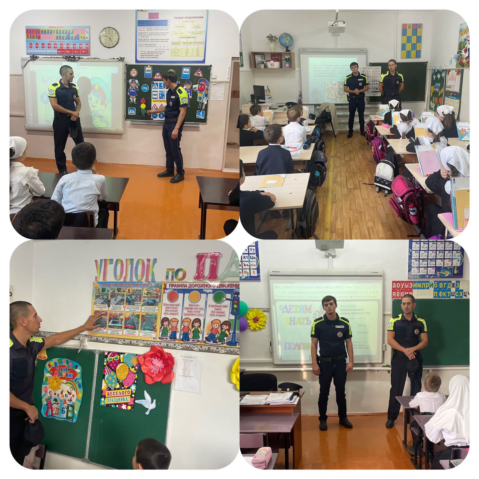 Согласно плана мероприятий месячника безопасности ДД «Внимание дети» , состоялась встреча учащихся школы с с инспекторами ДПС сержантом полиции Исраиловым Алиханом Алиевичем и старшим лейтенантом полиции Исаевым Александром Николаевичем.