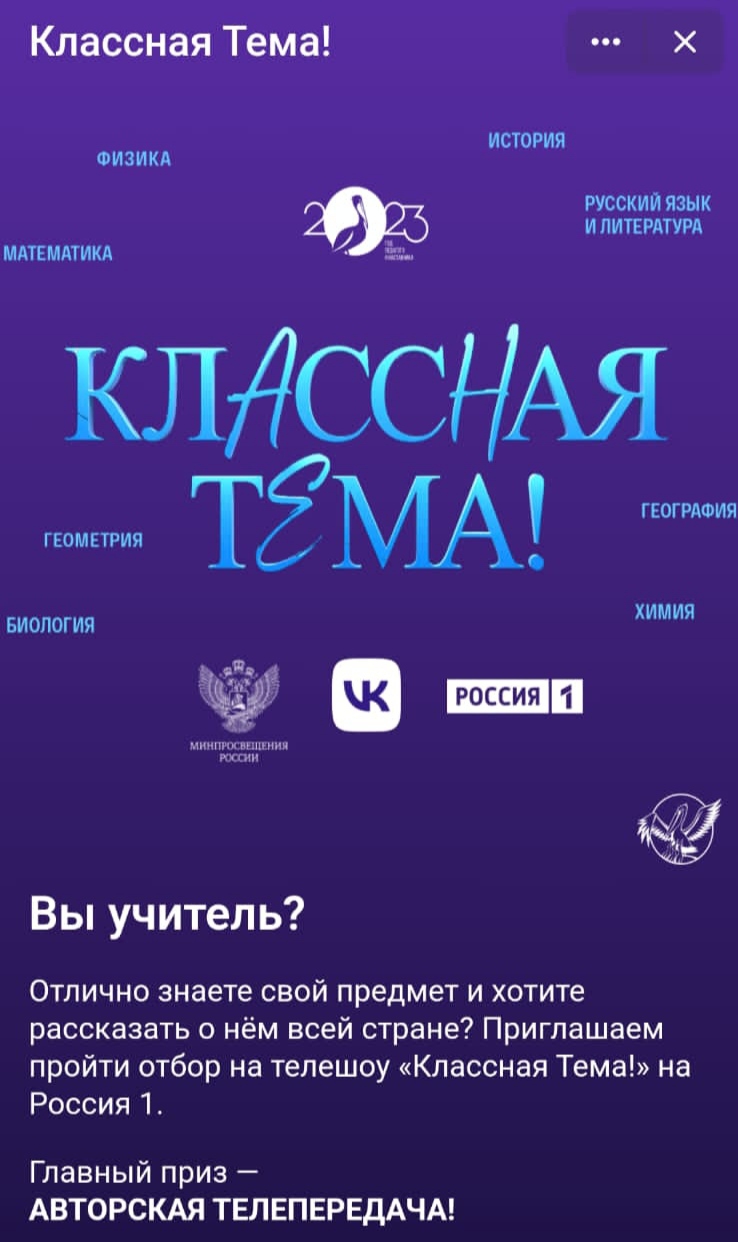 Отлично знаете свой предмет и хотите рассказать о нём всей стране? Приглашаем пройти отбор на шоу "Классная тема" на телеканале Россия 1. Главный приз - авторская телепердача. https://vk.com/app8217023