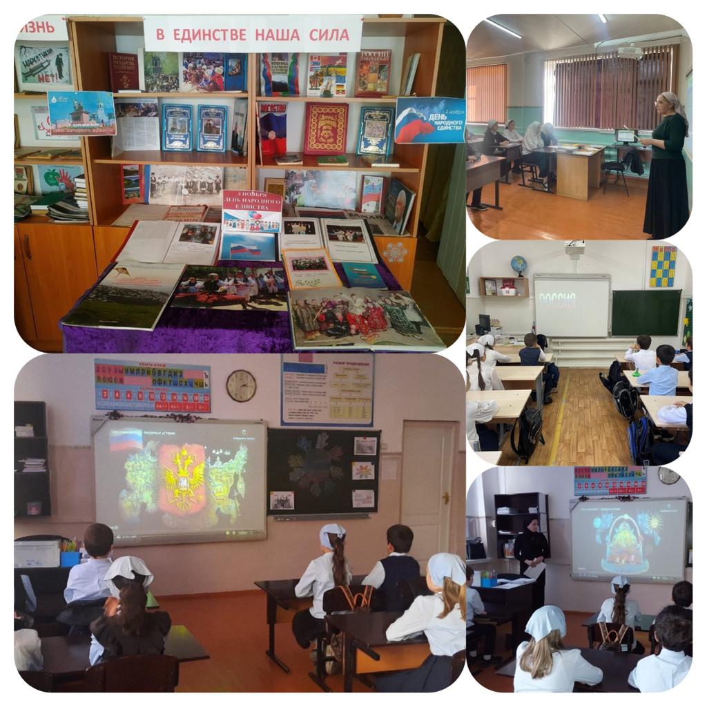 В ходе праздничной недели были проведены следующие мероприятия: 1.Во всех классах с 1 по 11 прошли классные часы на тему: «День Народного Единства». Учитель истории Борчашвили Ф.Т. в 5 «Б» классе рассказала об истории возникновения памятной даты – историческое событие «смутного времени», когда решалась судьба русского государства. 3.Библиотекарь Кангиева М.М.провела выставку книг ко Дню Народного Единства. 4.Учитель физической культуры Чигаев Р.Р.провел шахматный турнир в 8-9 классах. 5.В заключительный день все ребята приняли активное участие в концерте. Особенно отличились учащиеся 9 «А» класса.