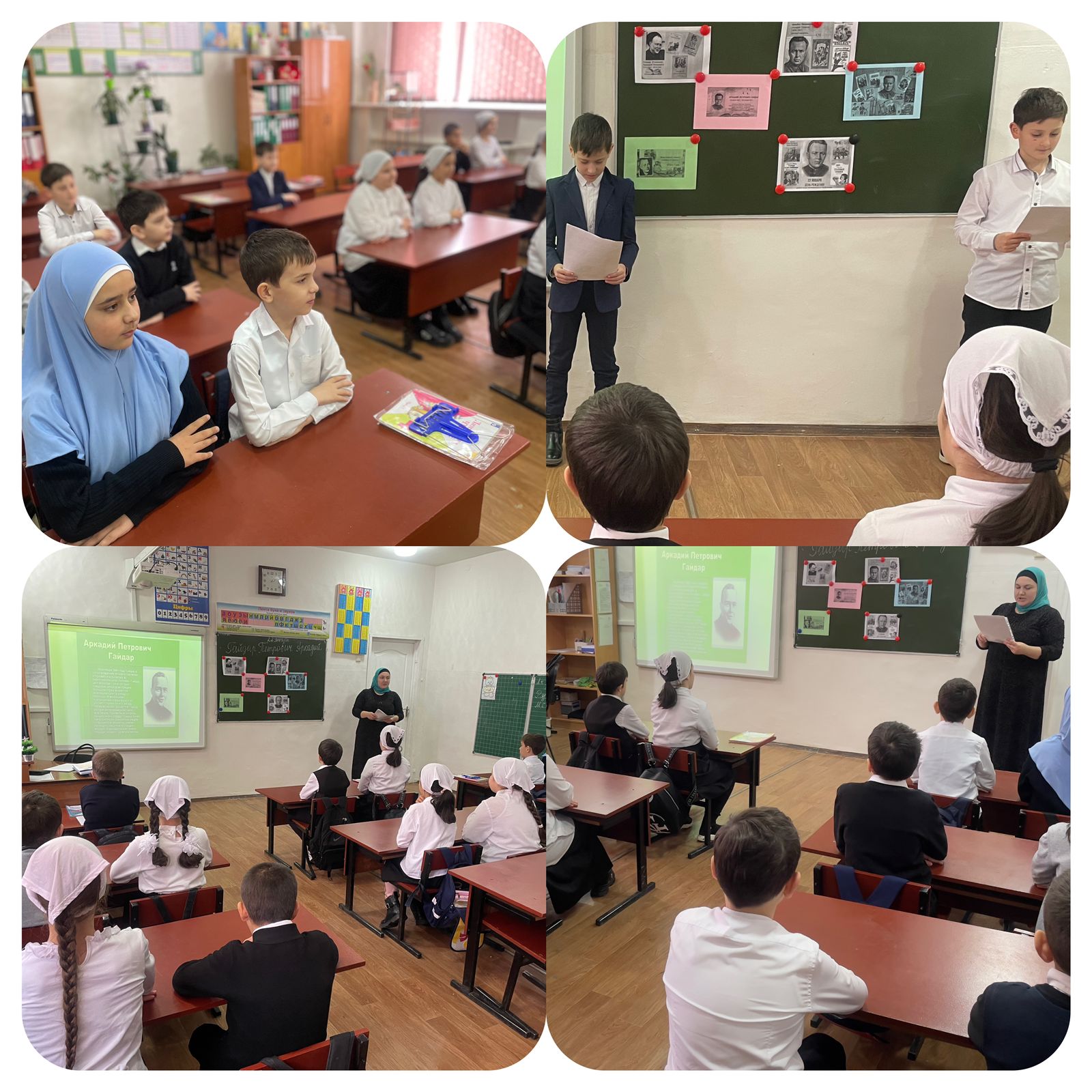 В честь120-летия со дня рождения выдающегося писателя в 4 Б классе прошло душевное и познавательное мероприятие. Ребята узнали о жизни и творчестве Аркадия Гайдара, познакомились с отрывками из его произведений, посмотрели мультфильм «Чук и Гек». В кабинете организована выставка книг.