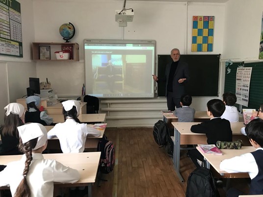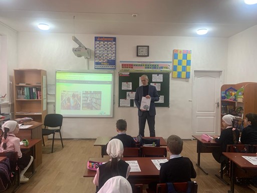 После линейки, посвященной церемонии поднятия Государственного Флага Российской Федерации и Чеченской Республики, прошло занятие "Разговоры о важном», в котором принял участие директор школы Конгиев Юнус Махмудович.