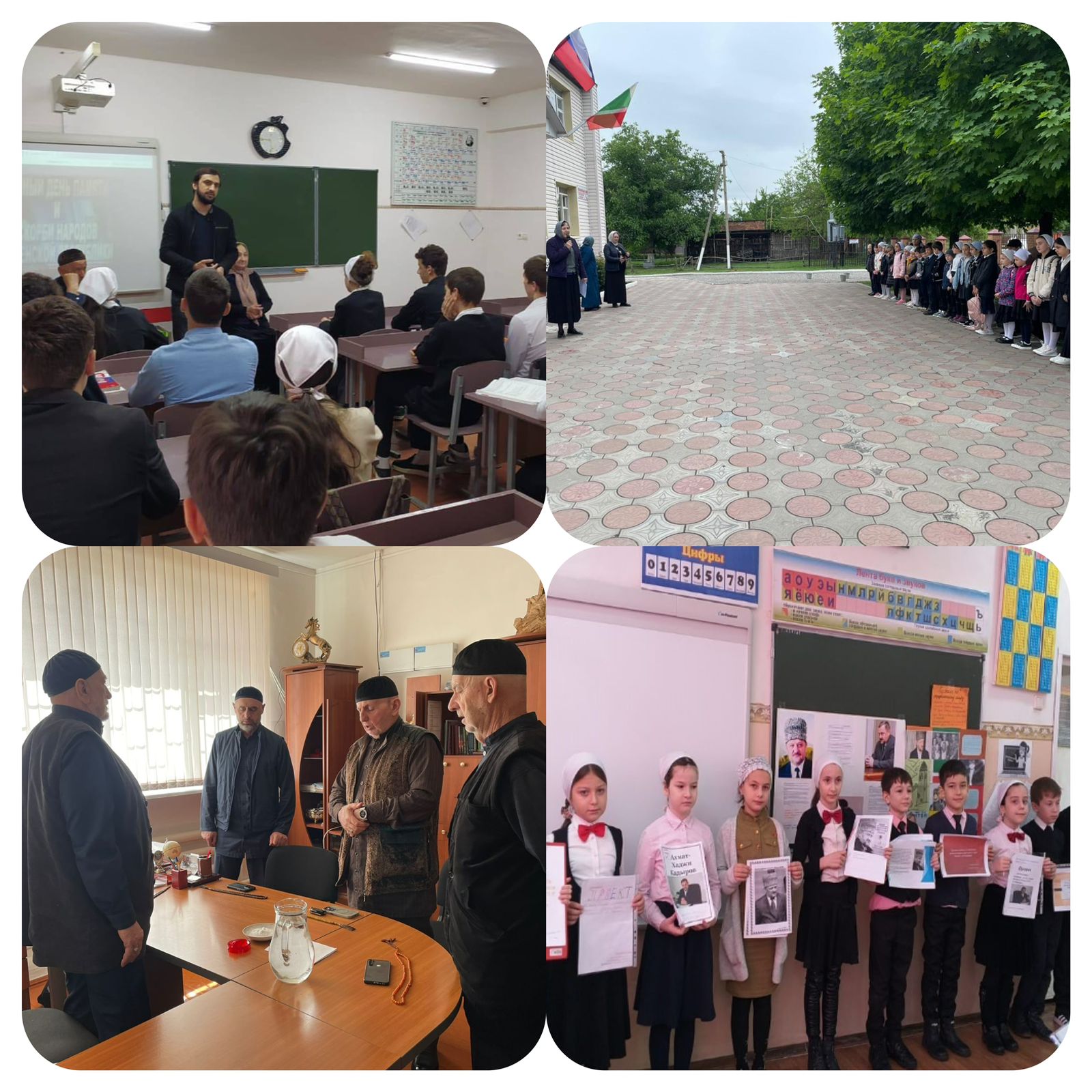 6 мая были проведены классные часы, беседы, уроки мужества «Жизнь и деятельность Первого Президента ЧР, Героя России А-Х Кадырова», «Он жил для народа и погиб за народ», на которых особо вспоминали Первого Президента Чеченской Республики, Героя России А.А. Кадырова, чья жизнь трагически оборвалась 9 мая 2004 года. Ребята подготовили презентации, в котором говорилось, что Ахмат- Хаджи Кадыров погиб, защищая целостность России и мирную жизнь чеченского народа. Он погиб, как Герой, как верный сын своего народа, как патриот России. Вечная память всем, кто отдал свои жизни за мир, порядок и процветание Чеченской Республики.