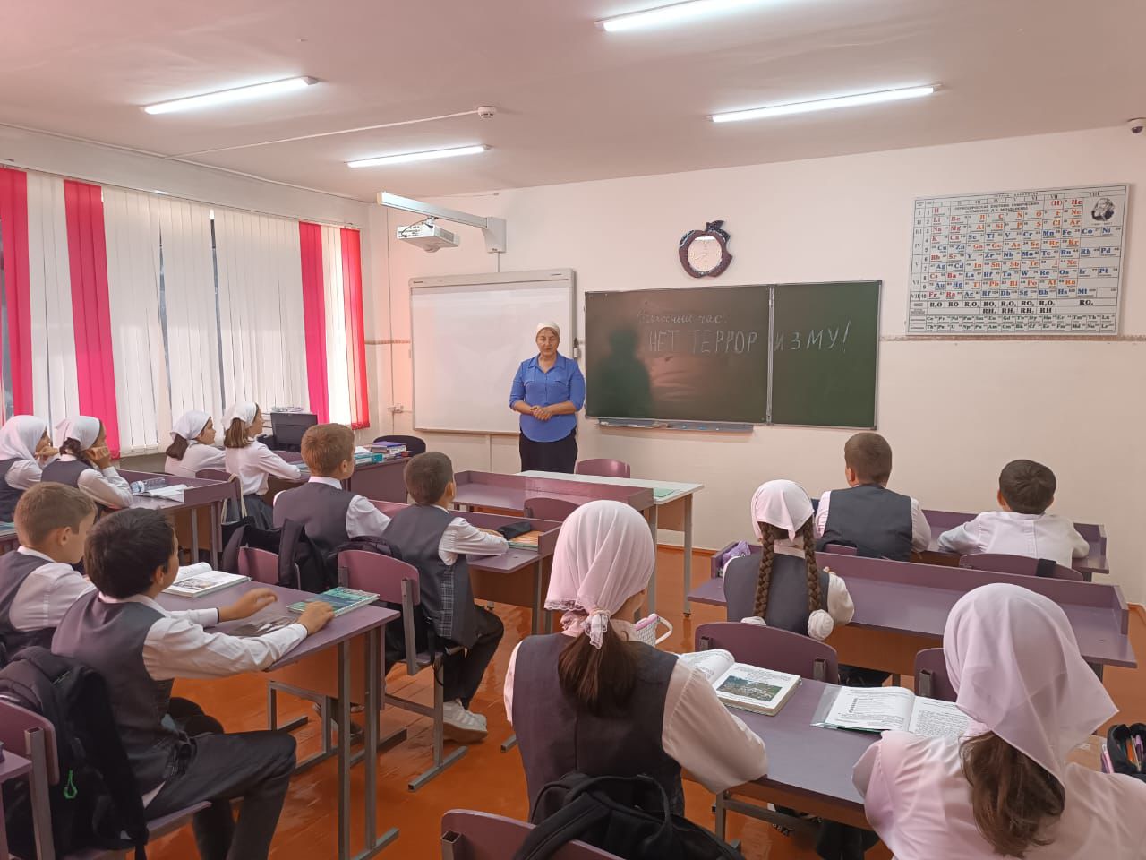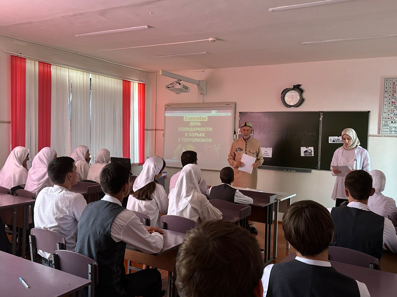 На классных часах говорили о том. что важно помнить, что с терроризмом следует не только и не столько бороться, сколько предупреждать его возникновение. Не ради красивых слов говорить о необходимости уважения культурных и конфессиональных особенностей, права на сохранение мира для всех народов, населяющих Россию. Только толерантность и взаимоуважение позволят предупредить разрастание социальной базы терроризма и лишат преступников надежды на поддержку в обществе.