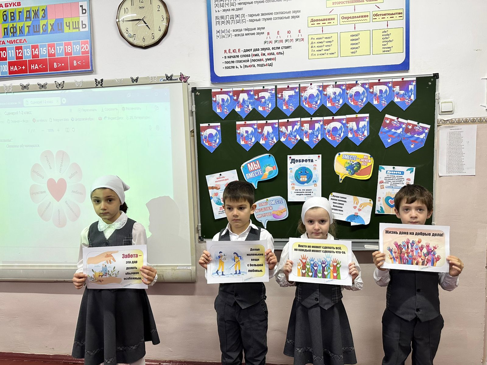 Для учеников начальной школы было предложено интерактивное задание, в котором их попросили продолжить пословицы и поговорки («Не одежда красит человека, а добрые дела», «Доброе дело дороже богатства» и др.). Им также показали фрагменты фильма «Мой друг Дима Зорин», побеседовали о том, какие качества важны, чтобы делать добрые дела.