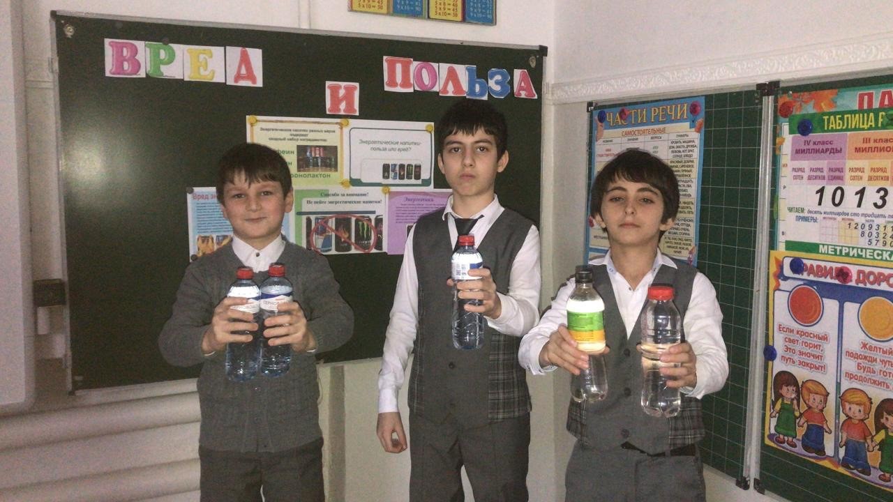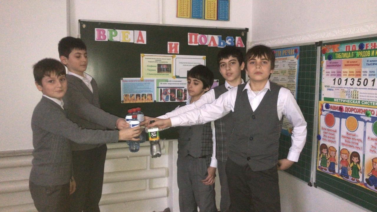 В ходе мероприятия Жарадат Ахмедовна объяснила четвероклассникам, что энергетические напитки больше вредны для организма, чем полезны, их употребление наносит непоправимый вред здоровью человека. Ребята рассмотрели компоненты, входящие в состав энергетиков, которые не только химически опасны, но и тормозят развитие личности.