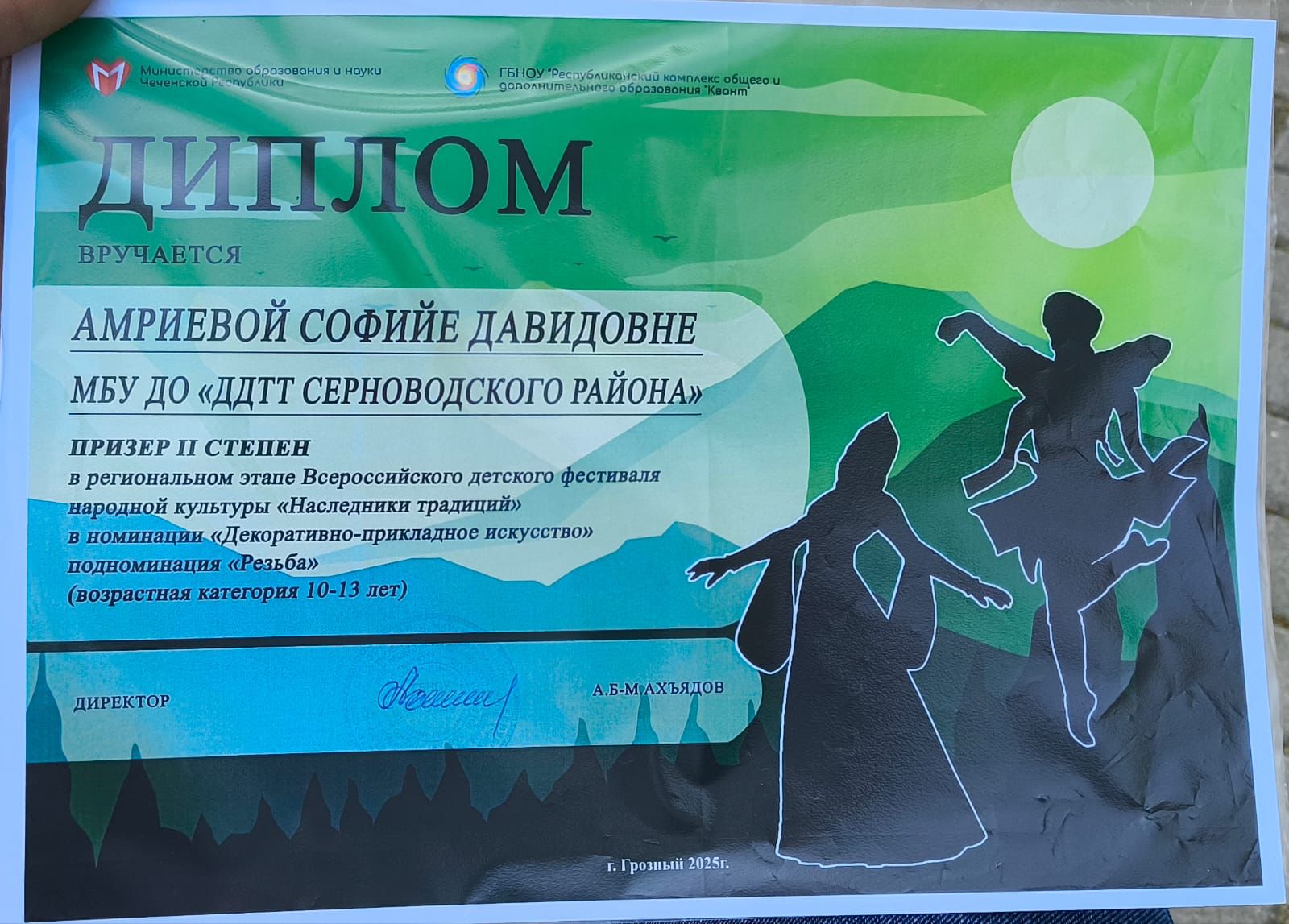 02.06.2025Ученица 7а класса МБОУ "СОШ №3 станицы Ассиновская" София Амриева стала призёром регионального этапа Всероссийского детского фестиваля народной культуры "Наследники традиций" в номинации "Декоративно-прикладное искусство" (резьба). София занимается в центре дополнительного образования МБУ ДО ДДТ Серноводского района.